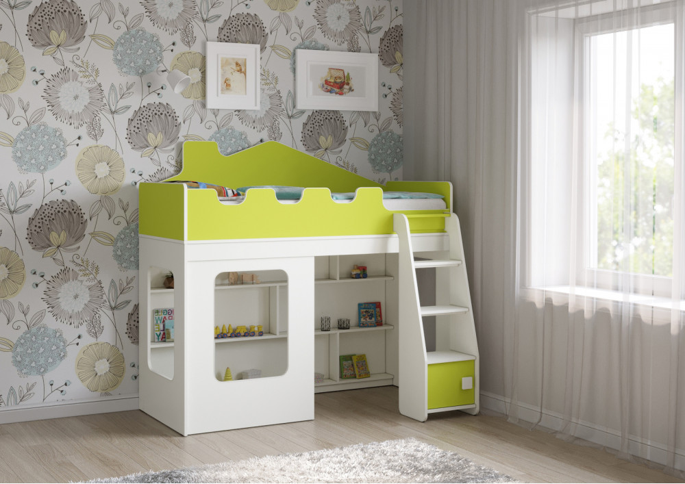 Особенностью этой модели является наличие прямой лестницы с дверцей, которая не только придает кровати-домику особый шарм, но и обеспечивает легкий и безопасный доступ к спальному месту. Стеллаж, расположенный внизу спального места, предоставляет дополнительные возможности для хранения вещей и игрушек.