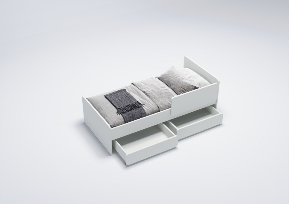 2.    Выкатные ящики: Кровать оснащена двумя выкатными вместительными ящиками, которые легко выдвигаются благодаря прямоходным колесам. Это удобное решение для хранения игрушек, одежды или постельного белья, помогая поддерживать порядок в детской комнате.