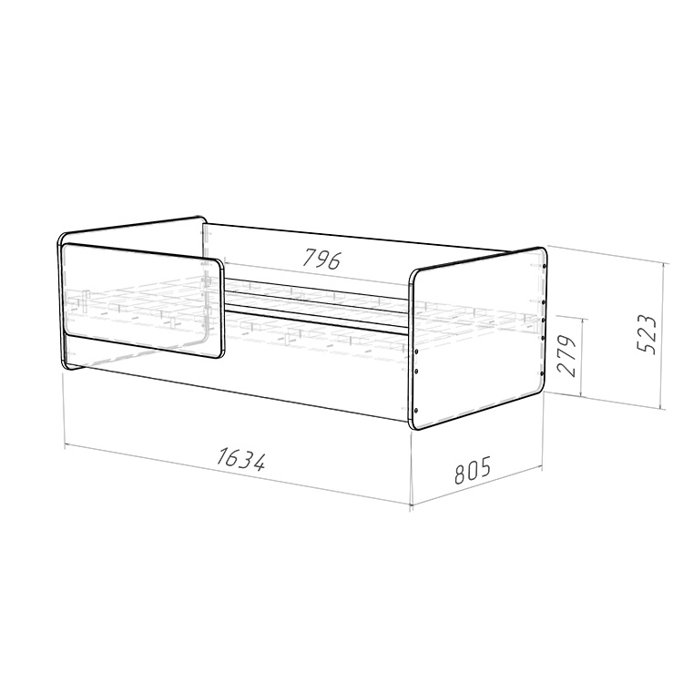 2.    Защита от травм: Кровать не имеет острых углов и обработана мягким противоударным кантом, что предотвращает возможные травмы и делает использование кровати безопасным для детей.