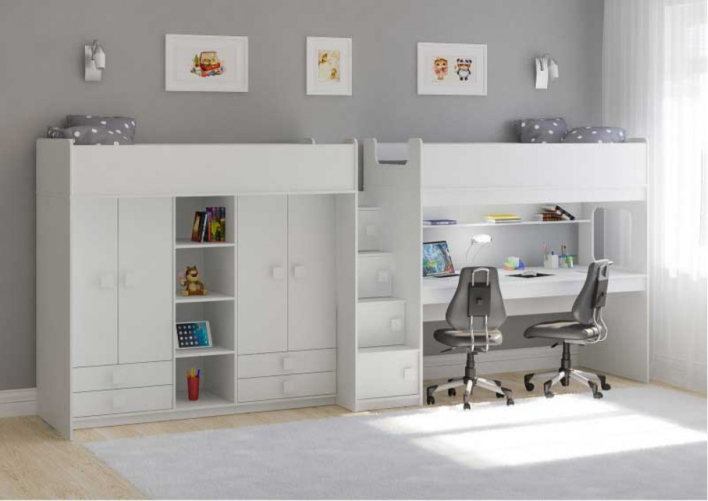 Под спальным местом  располагается рабочее место с большим столом и два шкафа с выдвижными ящиками.