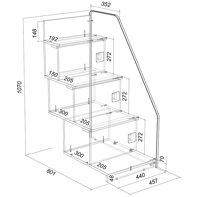 Лестница одновременно выполняет функцию стеллажа. Стеллаж оснащен фасадами ,чтобы получились полноценные дополнительные места хранения.